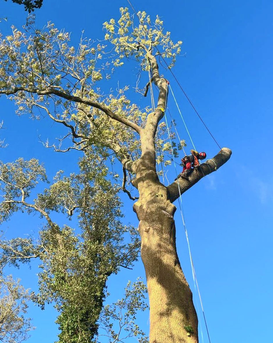 Mittels Seilklettertechnik erreichen wir jeden Bereich und bringen den Baum durch clevere Lösungen sicher zu Boden.